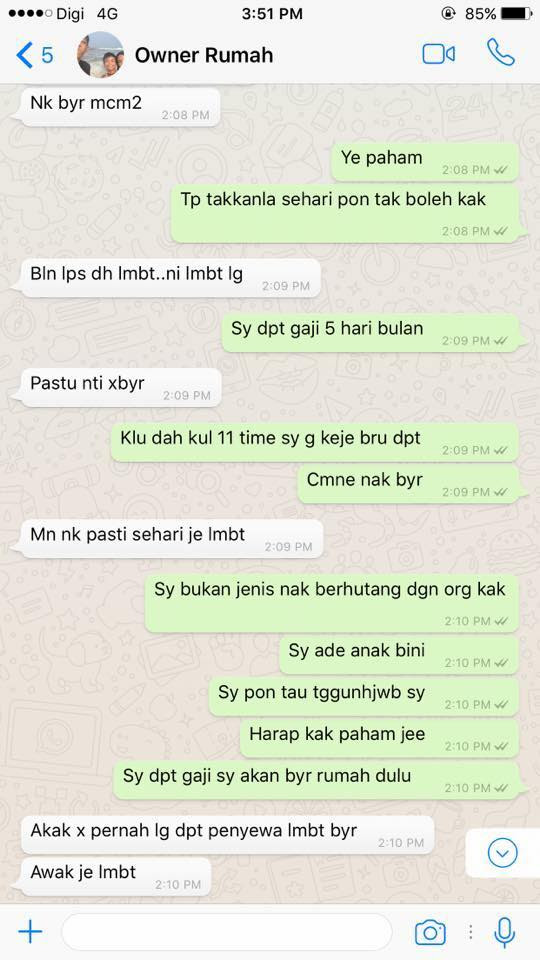"Janji tiap 5 hb, akak pun nak pakai duit. Patutnya hujung bulan tetapi akak dah tolak ansur 5 hb pun lambat. Kalau dah tak berminat sewa di situ, ada orang nak masuk.