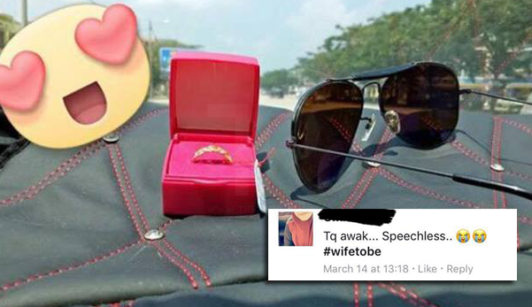 Malam 19 Mac dia balik, aku pun macam tak ada apa, ajak dia pergi tengok wayang, makan kemudian hantar dia balik. Masa itu aku dah perasan dia pakai cincin yang sama seperti dalam gambar itu tetapi aku tak syak apa-apa sebab sebelum ini dia ada pakai cincin dan bila aku tanya, dia kata 'ini buat sarung dekat tudung', aku pun okey sajalah.