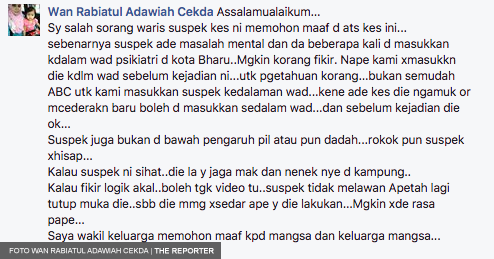 "Saya salah seorang waris suspek kes ini memohon maaf di atas kes ini. Sebenarnya suspek ada masalah mental dan telah beberapa kali dimasukkan ke dalam wad psikiatri di Kota Bharu.