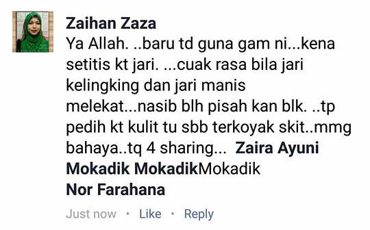 Menurut ibu mangsa, Fara Lia, kaki anaknya terkena gam tersebut yang melekat kuat sebelum pergi mendapatkan bantuan rawatan di Hospital Sultanah Nur Zahirah (HSNZ) baru-baru ini. Dan dalam masa yang sama beliau meminta ibu bapa semua berhati-hati dan tidak menyimpan gam tersebut di rumah.