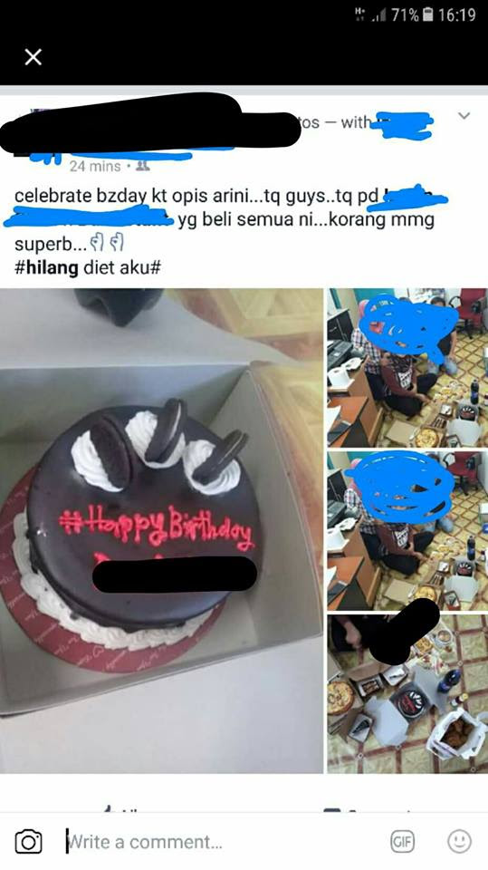 Hari ini adalah harijadi kerani itu dan dia pun memuat naik status di Facebook dengan ucapan terima kasih kerana support birthday dia dan dia tag nama suami dan kawan baik suami yang turut support birthday dia seperti kek Secret Recipe, kek 3 slid tambahan, Pizza, KFC bagai.