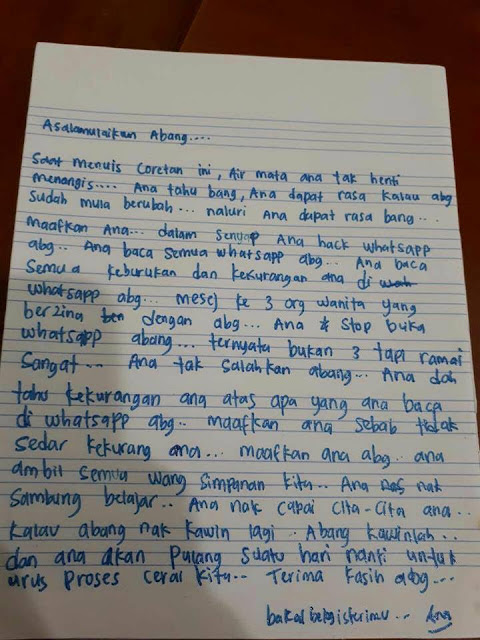 "Ana tak salahkan abang. Anak dah tahu kekurangan Ana atas apa yang Ana baca di WhatsApp abang. Maafkan Ana sebab tidak sedar akan kekurangan Ana. Maafkan Ana abang, Ana ambil semua wang simpanan kita. Ana rasa nak sambung belajar. Anak nak capai cita-cita Ana."