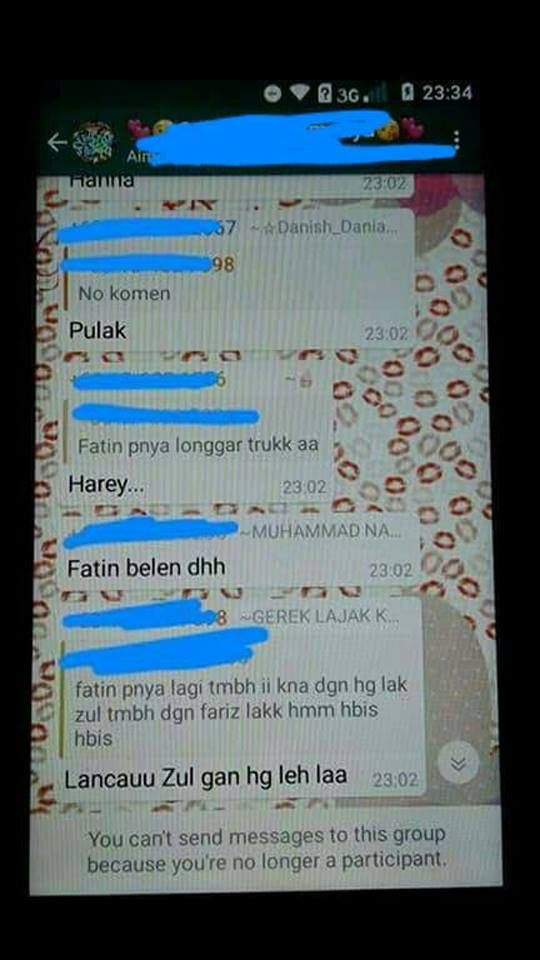 Tahukah anda, dalam group WhatsApp ini mengandungi pelbagai ayat lucah digunakan sehingga mereka membanding-bezakan kemaluan masing-masing sebesar mana. Allahu. Dan lebih parah lagi ada yang mengajak rakan sebaya menonton video porno.