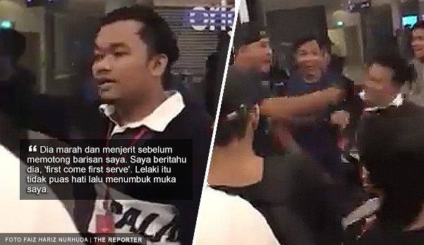 Bagaimanapun, mangsa, Faiz Hariz Nurhuda, 22, berkata, kejadian yang berlaku pada jam 6 pagi di sebuah pusat beli-belah di ibu negara, berpunca dari lelaki terbabit yang bertindak memotong barisan mereka.