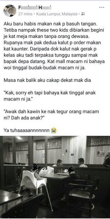 Perkongsian dari seorang wanita yang hanya dikenali dengan nama F.H mengenai sikap tidak bertanggungjawab pasangan suami isteri yang sanggup meninggalkan dua anak mereka bersendiri di meja tanpa pengawasan, mencetuskan pelbagai reaksi netizen.