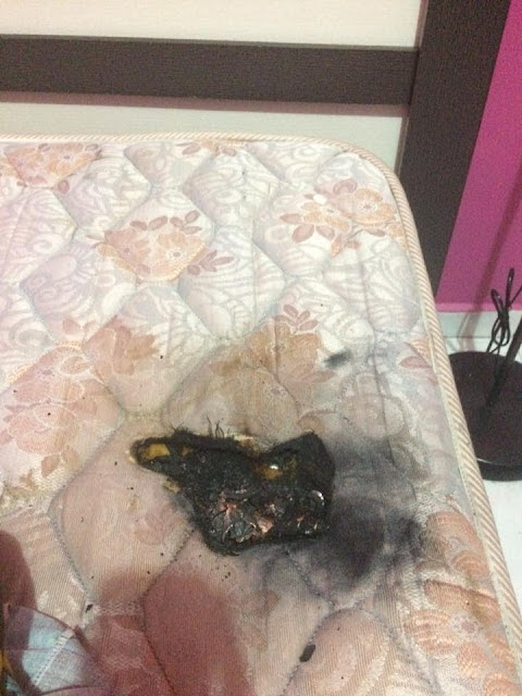 Saya ambil lagi kain basah yang lain dan tutup powerbank itu lagi. Selepas yakin tiada lagi letupan/percikan, terus ambil penyodok untuk buang powerbank itu. Alhamdulillah nothing happened to me. Cuma tilam saja yang berlubang. Sehingga sekarang saya masih rasa berdebar-debar lagi.